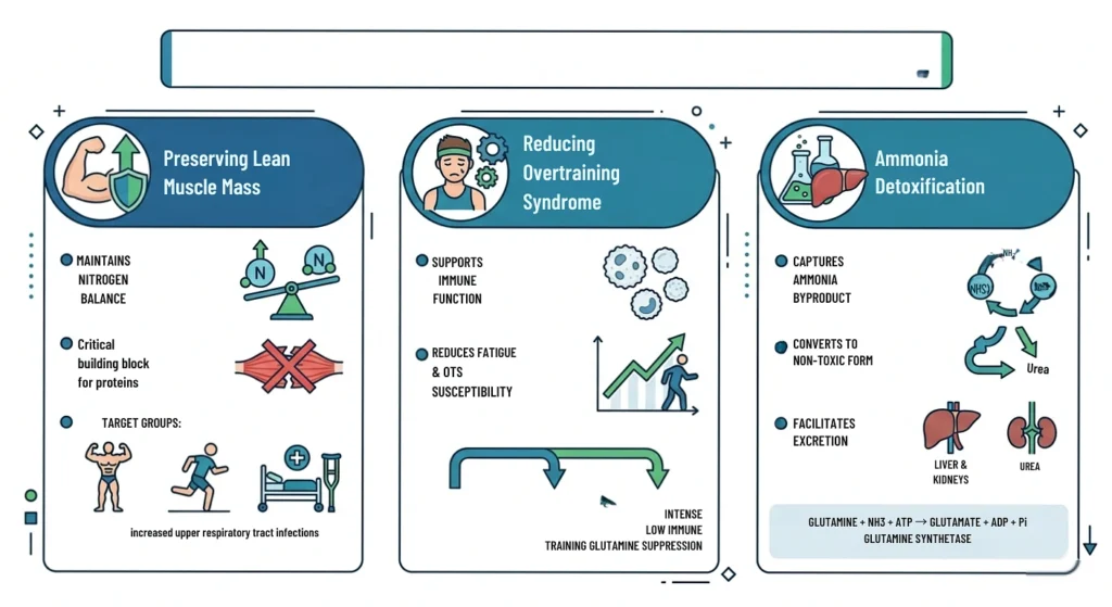The single largest storage site of glutamine in the body is skeletal muscle. During caloric deficits, extended training camps, or illness-related muscle wasting, supplemental glutamine helps maintain nitrogen balance and mitigate muscle protein breakdown. This makes it particularly relevant for: