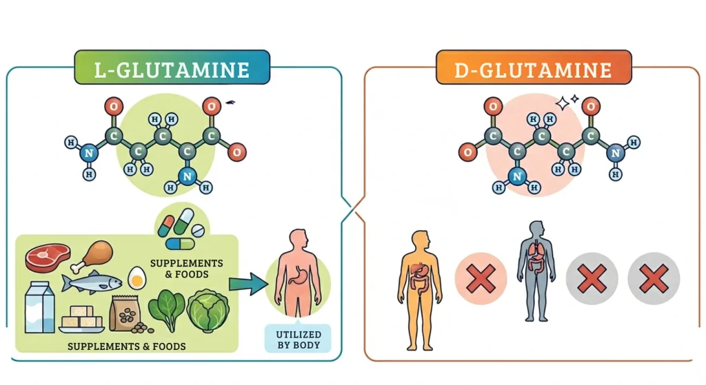 In practice: When you see “glutamine” on a supplement label without further specification, it almost always refers to L-glutamine, the active and relevant form.